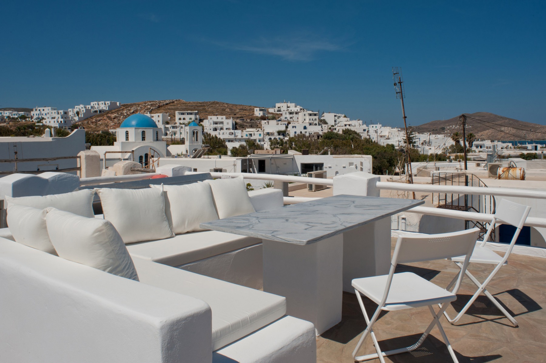 The house consists of a living room, a dining room and a bathroom on the ground floor. Three bedrooms and a bath room on the first floor (two bedrooms with a double bed each and a bedroom with two single beds). A small wooden staircase leads to the terrace with its magnificent view of Naoussa Bay!