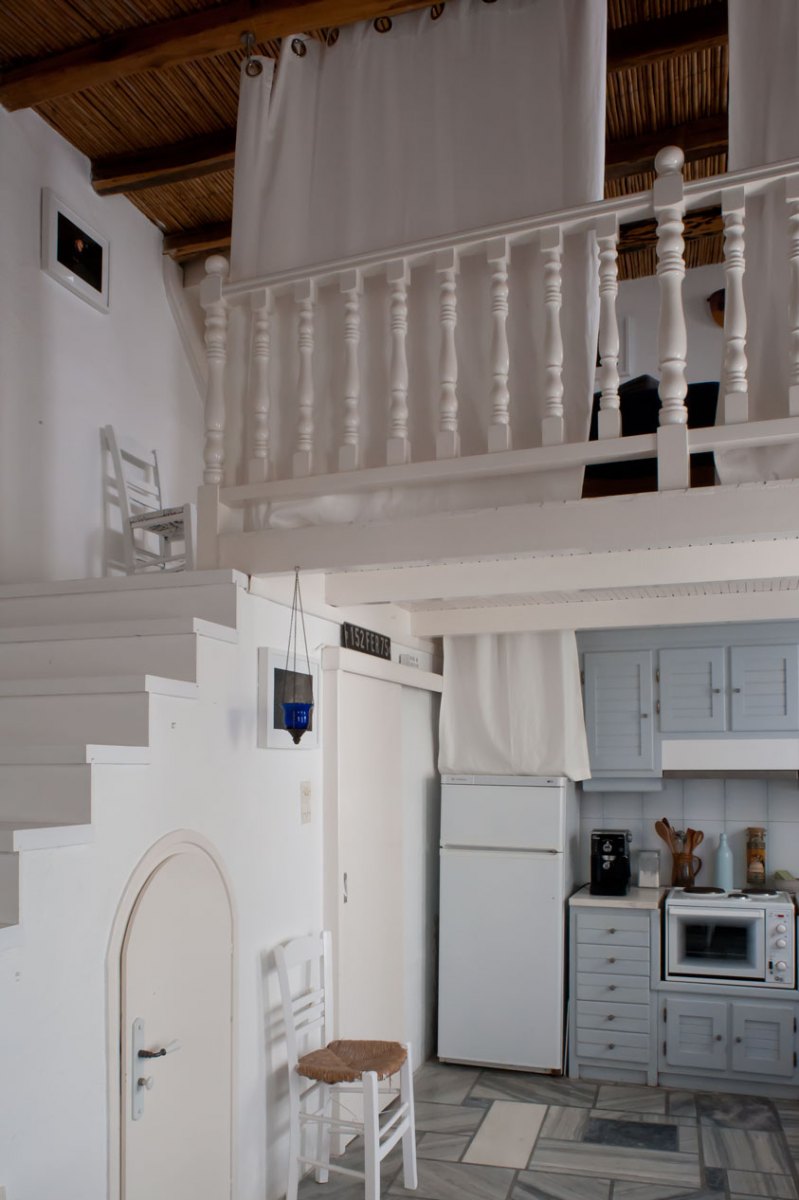 Au rez-de-chaussée il y a le salon / salle à manger, la cuisine équipée et la salle de bain séparée. Quelques marches plus haut, sur la mezzanine il y a deux couchages avec deux lits séparés. La chambre double climatisée se trouve au premier étage, ainsi que la terrasse avec vue sur la mer. Sur la terrasse il y a une belle table en marbre et des chaises pour prendre les repas à l’extérieur.